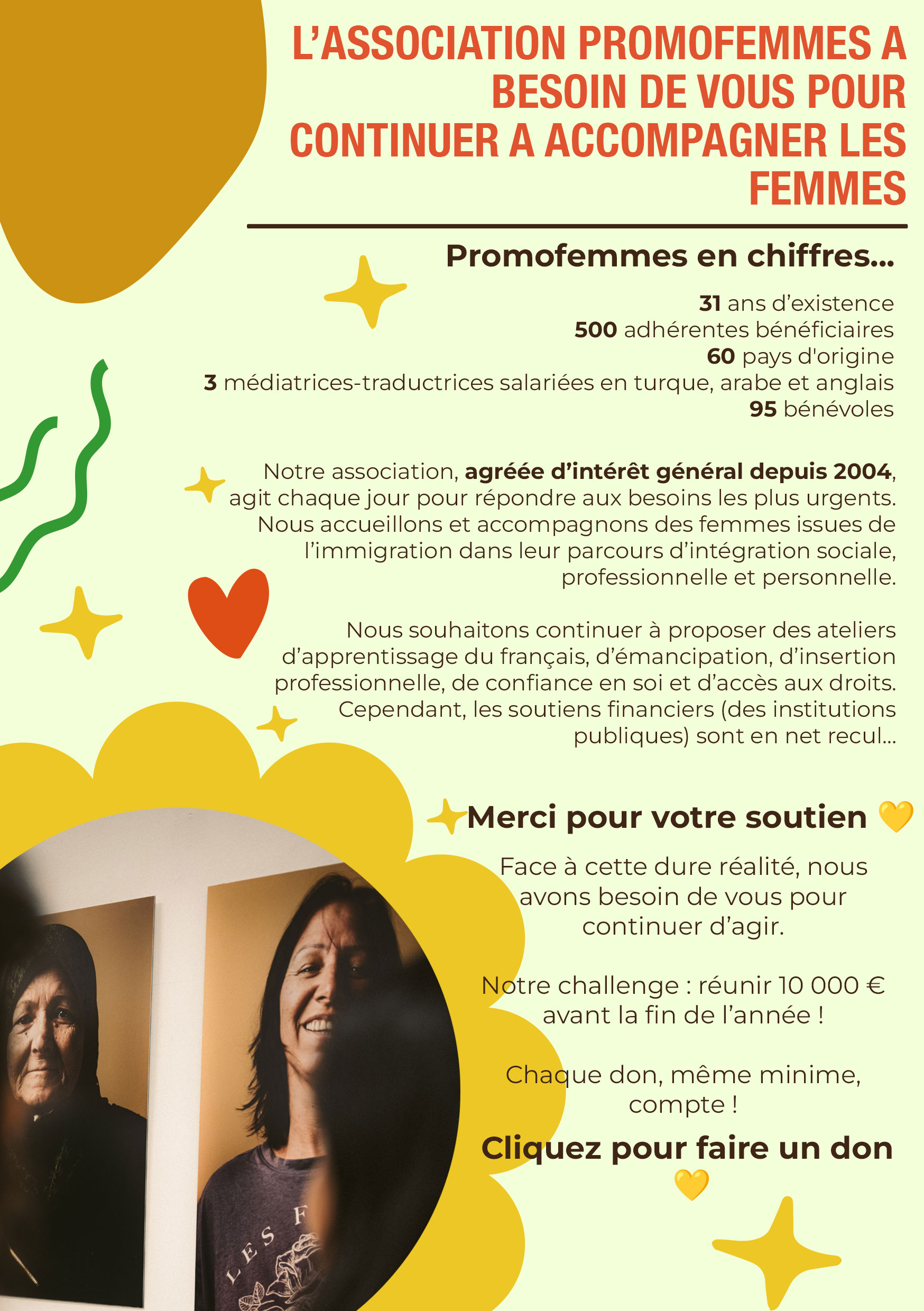 Ainsi, la passerelle entre « bénéficiaire » et « bénévole » est possible et toujours encouragée, les bénéficiaires sont régulièrement sollicitées pour participer, proposer et animer (avec l’accompagnement d’une référente si nécessaire) un atelier, une activité ou une sortie. Cela fait complètement partie du processus d’émancipation personnelle que nous encourageons au quotidien.